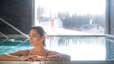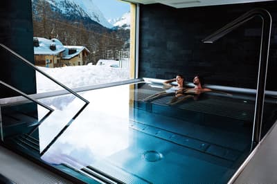 Un hôtel de montagne luxueux et élégant avec une vue sublime, un spa avec piscine, deux bons restos et un bar sur le toit.