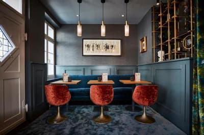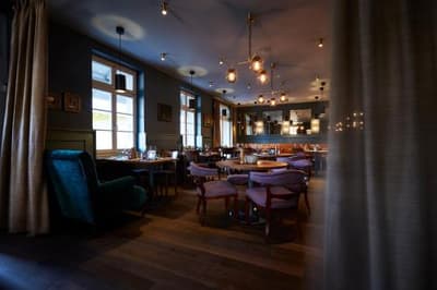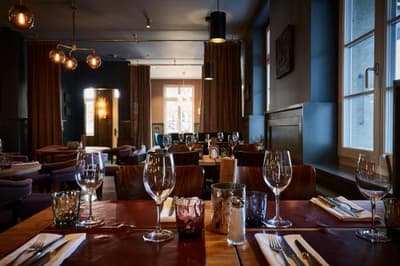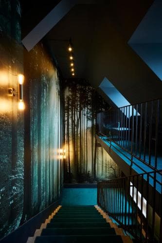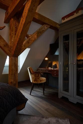 Vous êtes dans un temple de la déco tendance et comfy à l’hôtel Spedition Thun ! Alors si vous cherchez un lieu à la fois ressourçant, inspirant et cosy, c’est ici qu’il faut venir. Dans cette maison centenaire pleine de charme, rien que la terrasse vous donne envie de chiller dès votre arrivée ! On se croirait sous un porche de Wisteria Lane dans Desperate Housewives avec ses petites loupiotes ! Et à l’intérieur, vous allez retrouver un esprit home sweet home hyper sympa. La déco de l’hôtel a déjà reçu de nombreuses distinctions d’ailleurs... Vous allez aimer cette alliance de matières chaudes, de cuir, de velours et de lin, mêlé au bois brut et aux poutres en chêne anciennes. La cage d’escalier et les couloirs vous emmènent tout droit dans un univers imaginaire plein de douceur avec ce papier peint ambiance forêt mystique et cette moquette vert émeraude. Féérique et envoûtant ! Avec une ambiance tamisée à souhait. Du coup, pas étonnant que dans les chambres, cet esprit romantique demeure. A vous les têtes de lit en bois sculpté, les jetées de lit matelassés en velours et les vieux secrétaires en guise de bureau sous les poutres et les combles en chêne. Et ces fauteuils douillets dorés ou bleu pétrole en velours... L’ambiance est tellement cosy ! Vous n’aurez plus envie de décoller d’ici. Si ce n’est pour profiter de la jolie petite ville et du resto de l’hôtel, qui lui aussi envoie du steak : vous vous régalerez de délicieuses viandes maturées sur place, avec d’excellents röstis. Dans un espace agréable, entre bois ancien, carrelage coloré années 30 et banquette capitonnées vertes. Le tout avec un éclairage largement inspiré de l’Art Déco. Bref, une pépite design, idéale pour une escapade en amoureux en Suisse !