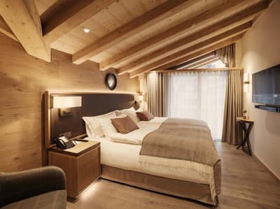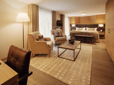 Encore plus spacieuse, elle est superbe. Les grandes fenêtres vitrées profitent d’une vue merveilleuse sur les montagnes. Elle accommode un grand lit et dispose de beaux fauteuils dans le coin salon. Salle de bain avec douche à effet de plus ou baignoire.