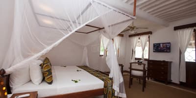 Les 19 chambres Swahili se situent au dernier étage de l'hôtel, surplombant de magnifiques jardins. Elles possèdent un très grand lit double à baldaquin, des meubles en bois sombre et du carrelage au sol.