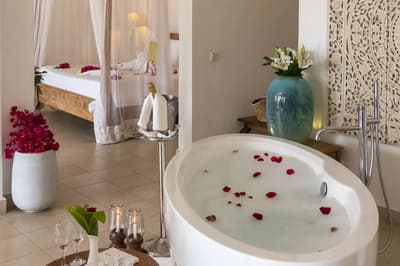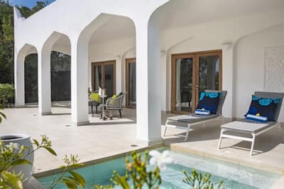 Nichée parmi la végétation luxuriante, elle baigne dans une atmosphère relaxante. L’extérieur est aménagé d’une petite piscine et de longues chaises. Petit coin salon avec de beaux fauteuils. Salle de bain chic avec baignoire et douche à effet de pluie.