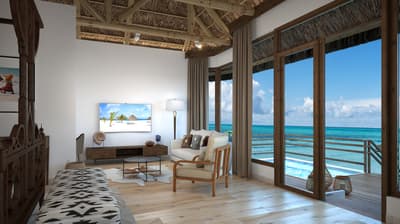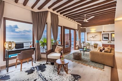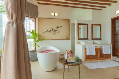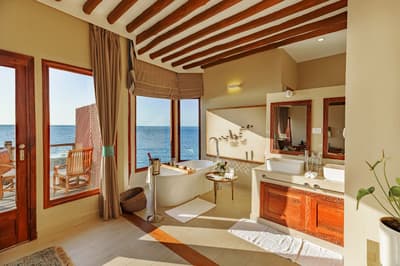 Cette belle villa installée sur la plage profite d’une vue merveilleuse sur l’océan. L’extérieur est aménagé d’une petite piscine et de longues chaises. Elle offre un accès direct à la plage. Petit coin salon avec de beaux fauteuils. Salle de bain chic avec baignoire et douche à effet de pluie.