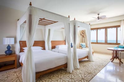 D'un côté les eaux turquoise hérissées de petites îles, de l'autre les palais de Stone Town, la vieille ville de Zanzibar classée à l'Unesco... Voilà le bon spot pour vous immerger dans la culture de la côte swahilie ! L'emplacement est privilégié : vous serez logés dans une demeure historique, elle aussi classée. Son nom swahili signifie "qui ne peut être imité" tant son architecture avec ses balcons dentelés de bois était singulière lors de son édification au XIXe siècle. Aujourd'hui, les 67 chambres et suites se répartissent entre le bâtiment ancien et le nouveau, la plupart face à la mer. A vous les longues heures à chiller sur votre terrasse en contemplant le ballet des boutres — ces bateaux traditionnels en bois qui ont longtemps fait la navette avec la péninsule arabique et indienne au gré des moussons! Vous retrouverez les influences nées de leurs périples... dans l'assiette savoureuse. La cuisine swahilie, aux parfums (légers) des fameuses épices de l'archipel, mixe recettes indiennes, arabes mais aussi africaines. Profitez-en pour prendre un cours de cuisine et apprendre à concocter la sauce mchuzi qui twiste poissons et fruits de mer tout frais pêchés ! Vous pourrez aussi les déguster au cours d'un pique-nique tout ce qu'il y a de plus chic sur un ilot rien que pour vous. Ou pendant une croisière façon sultan avec snorkeling, pêche, ou tours en kayak suivis d'un déjeuner. Mais revenez aussi les pieds sur terre (ou pas) pour arpenter les ruelles de la médina. Entre musée à la gloire des sultans d'Oman, maîtres de l'archipel au XIXe siècle, vieux fort arabo-portugais, marché coloré, mémorial de l'esclavage, et ruelles bordées de palais aux portes cloutées, prévoyez large ! De retour à l'hôtel, vous en apprécierez mieux les vastes terrasses ouvertes sur les brises de la mer, bibliothèque, spa intimiste et infinity pool !