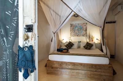 L’ensemble est dans un style de décoration tropicale et moderne avec des tableaux à motifs africains, un mobilier en bois épuré, un lit king size, de grandes moustiquaires contenant un ventilateur de plafond et se complète dans des tons neutres. Affalez-vous dans le canapé de 180 cm qui peut accueillir 1-2 personnes supplémentaires pour des moments farnientes. La salle de bains comprend de l’eau chaude grâce aux panneaux solaires. Le tout dans une ambiance ensoleillée et conviviale !
