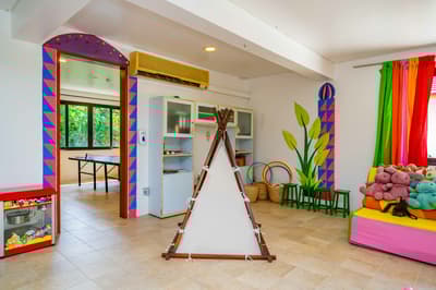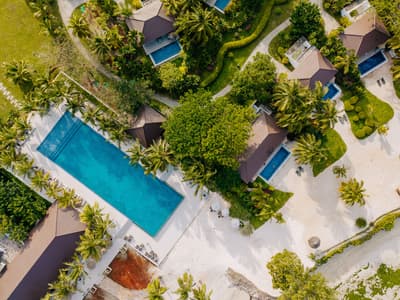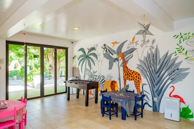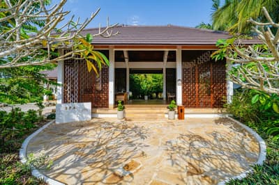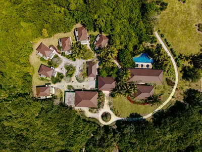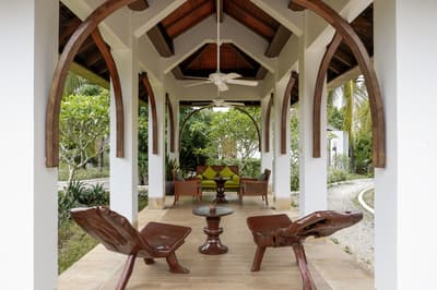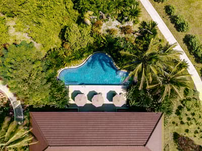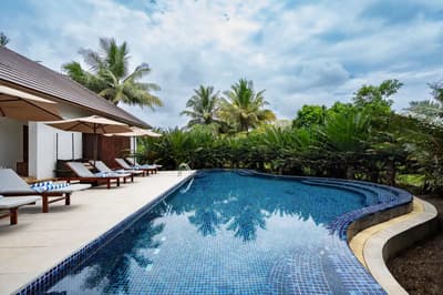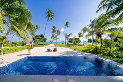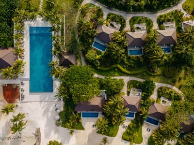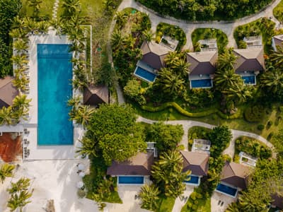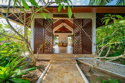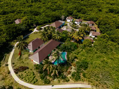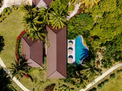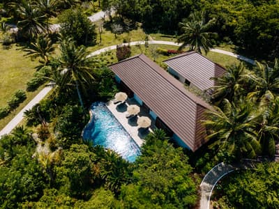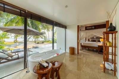 Le décor est dans un style raffiné avec un mobilier en bois haut de gamme et des couleurs neutres. La suite principale est dotée d'un lit king-size à baldaquin et la suite junior de lits jumeaux. Toutes deux sont équipées d'une salle de bains privative et de portes françaises que vous pouvez faire coulisser pour laisser entrer la brise ou sortir pour nager dans la piscine. La salle de bains est bien équipée, le tout dans une ambiance chaleureuse et tropicale !