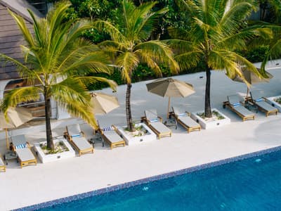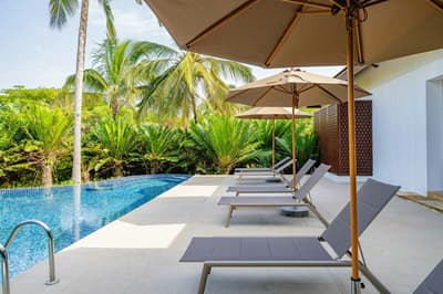 Pouvant accueillir confortablement quatre personnes, cette villa Deluxe est située à quelques pas de la plage et dispose d'un grand salon donnant sur une piscine et d’une terrasse privées, meublées. Elle comprend un lit de jour et des chaises longues avec parasols pour se prélasser au soleil ou pour savourer un dîner romantique à deux, devant le coucher du soleil.