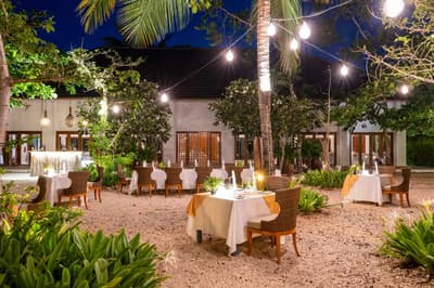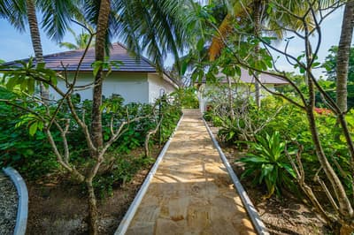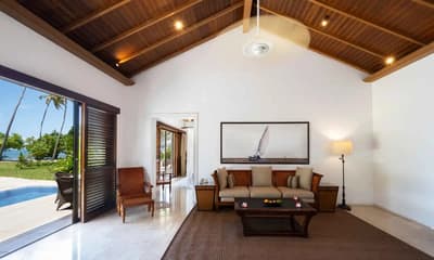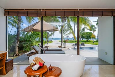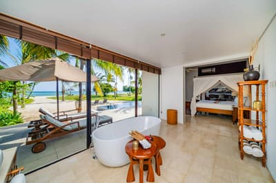 Le décor est dans un style raffiné avec un mobilier en bois haut de gamme, des couleurs neutres, et la chambre à coucher dispose d'un lit king-size central à baldaquin. La salle de bains spacieuse comprend deux lavabos, une baignoire autoportante et une douche séparée; vous pourrez également prendre des bains rafraîchissants avec une douche extérieure. Le tout dans une ambiance chaleureuse et tropicale !