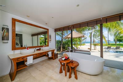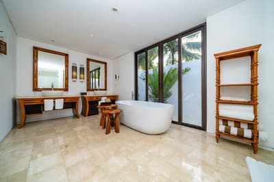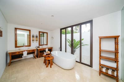 Le décor est dans un style raffiné avec un mobilier en bois haut de gamme, des couleurs neutres, et la chambre à coucher est équipée d'un lit king-size central à baldaquin. La salle de bains spacieuse comprend deux lavabos, une baignoire autoportante et une douche séparée ; vous pourrez également prendre des bains rafraîchissants avec une douche extérieure. Le tout dans une ambiance chaleureuse et tropicale !
