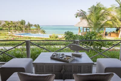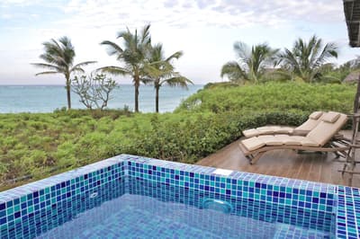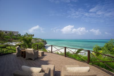 Dans l'univers de la Zanzibar Collection, petite famille d'hôtels exclusifs, voila le plus perché ! Du moins par sa position : sur une falaise de la côte sud-est avec vue panoramique sur les eaux turquoise de l'océan Indien. Car pour le reste, cette adresse élégante a tout de la pépite, avec 12 villas seulement pour un séjour intimiste. Sur votre terrasse avec plunge pool, vous pourrez passer des heures à compter les nuances de bleus, enfin à essayer, il y en a tellement ! A 5 minutes de bateau seulement s'étend l'un des plus beaux récifs coralliens de la côte est de Zanzibar. Chaussez palmes, masques et tubas pour l'explorer et bookez une promenade avec le biologiste marin maison pour devenir incollable sur l'écosystème de la côte. La Zanzibar Collection met un point d'honneur à sensibiliser staff et clients à la préservation de la nature, et beaucoup d'activités sont centrées autour de l'environnement et de la culture locaux, profitez-en pour prendre un cours de cuisine swahilie, visiter un village authentique de la côte et ses équipements médicaux financés par le groupe, ou explorer la forêt primaire de Jozani, où vous observer les colobes roux, espèce endémique de Zanzibar. Et après tout ce vert, retour au grand Bleu, les pieds dans le sable de la petite crique aménagée ou dans la longue piscine dont la couleur azur matche parfaitement avec le ciel et l'horizon !