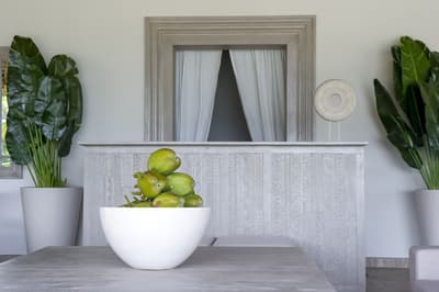 La déco des 12 villas est très sobre, dans des tons plutôt ternes que sont le gris et le crème. Le lit est au milieu de la chambre, avec un coin salon un peu plus bas dans la pièce. On trouve quelques miroirs au mur mais pas d'autre décoration.