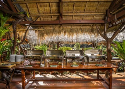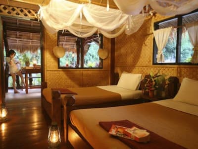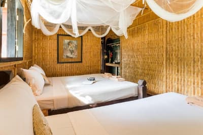 Traditionnelle et rustique, elle s’harmonise avec la nature environnante. Ses meubles de couleurs miel et son toit en chaume rendent l’ensemble très exotique. Les murs tapissés de rotin ramènent dans le temps. C’est l’idéal pour un séjour reposant et relaxant.