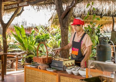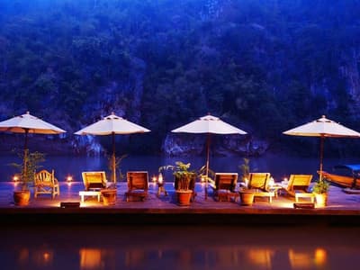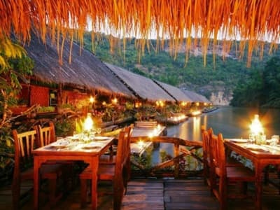 À l'ouest de Bangkok, perdu dans la province sauvage de Kanchanaburi, se cache l’une des destinations les plus insolite de vos prochaines vacances. C'est en long tail boat que vous arriverez au River Kwai Jungle Rafts, en remontant le fil de la rivière Kwai Noi, serpentant entre les montagnes et l'épaisse jungle du Sai Yok National Park. L'hôtel s’inspire du style de vie du peuple Môn, avec ses pavillons en bois flottant sur l’eau, ses meubles taillés à même le teck et ses hamacs se balançants avec lassitude sur des terrasses en bambou. Les Môns sont une minorité de tribus vivant le long de la frontière entre la Thaïlande et la Birmanie et c'est au travers de leurs étonnantes traditions que votre séjour prendra tout son sens. Le concept ? Vous réconcilier avec un quotidien plus simple, au milieu d’une nature intacte, sans Internet, ni électricité et partir à la rencontre de ces minorités locales. Une expérience magique, coupée du monde, dans un hôtel-village avec des restaurants aux assiettes remplies de la pêche du jour, un théâtre où des spectacles culturels vous en mettent plein les yeux et un cabanon de massages thaïlandais pour ne pas perdre le goût des choses simples. Votre voyage est un retour aux sources, au rythme de l’eau et au délicieux goût d’aventure.