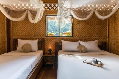 Nichée parmi la végétation tropicale, c’est un havre de paix. Dans le style d’une maisonnette construite sur un radeau fait de bambou, elle est en première loge pour apprécier la tranquillité du fleuve. C’est un espace ouvert trouvant un juste milieu avec la nature. Terrasse aménagée de hamacs et de longues chaises. C’est parfait pour se couper du quotidien dans un cadre authentique.