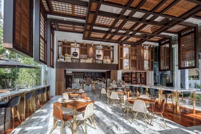 A première vue, l’extérieur du 137 Pillars Suit ne paie pas de mine. Pourtant, dès l'entrée, la beauté du lieu se révèle, mélant design contemporain et culture locale. La couleur bleue est dominante. Les éléphants sont partout, des luminaires jusqu'à l’imposante fresque murale, en passant par les petits objets de déco. De hauts panneaux en bois ancien alternent avec des baies vitrées, laissant deviner un jardin enchanté où se retrouvent voyageurs et habitants du quartier pour déjeuner. Quelques étages plus haut, on se croirait sur le plateau de tournage de la série Mad Men. Dans le bar à scotch et à cigares du Jack Bain’s Bar, les fantômes de gentlemen flottent encore. Le tout bois, les fauteuils en cuir vieilli et les vieilles cartes au mur ressucitent en effet l'époque coloniale. Au même étage, on découvre aussi une superbe piscine à débordement, entourée par deux jacuzzis à l’abri des regards et des daybeds d’où observer la ville. C'est le moment de commander un cocktail au Marble Bar ! Si vous ne redoutez pas le vertige, jetez un œil à travers le plancher en verre ! C'est époustouflant ! Et que dire du spa Nitra situé juste au-dessus. Cherry on the cake, la piscine du rooftop avec sa vue à 360, est réservée aux clients des suites. On y vient au sunset, ou sunrise, et même pour un bain de minuit… Quelle vue mais quelle vue ! Pas sûre que vous puissiez la trouver ailleurs qu'à Bangkok. Sortez votre plus beau maillot de bain et posez pour votre feed instagram avec un ciel de mille couleurs !