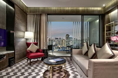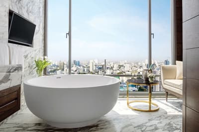 L’ensemble est moderne et élégant avec un lit confortable king-size standard 137 Pillars, un canapé et une kitchenette avec des équipements et appareils de classe mondiale. La salle de bain est équipée de douche et baignoire avec une fenêtre ouvrant sur la ville. Le tout dans une très belle ambiance chic et reposante !