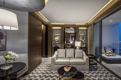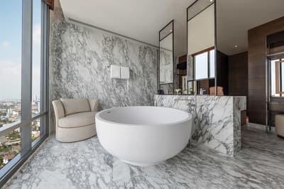 L’ensemble est moderne et élégant et peut disposer de lits jumeaux ou king size. La chambre est dotée d’un salon spacieux et d’un coin repas et la salle de bain luxueuse en marbre est équipée d'une baignoire circulaire 137 Pillars avec télévision intégrée. Le tout dans une très belle ambiance chic et reposante !