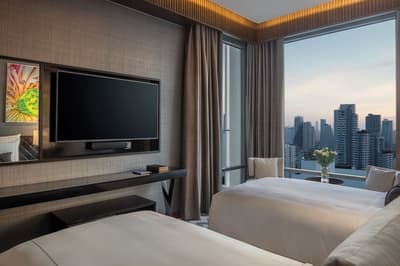 Linge de lit en coton égyptien, Peignoirs et pantoufles en peluche, Vaste choix d'oreillers, Matelas de luxe de marque premium, Système audio Bose, Eclairage d'ambiance, Sel de bain de l'Himalaya, Piscines à débordement au niveau 27 et sur le toit, Accès jardin de plantes aromatiques, Nitra Serenity Center pour les traitements de spa, Télévision intégrée, Table de maquillage.