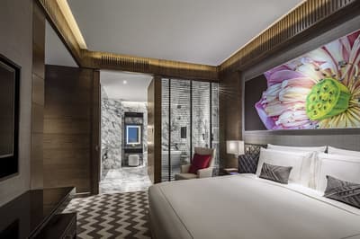 L’ensemble est moderne et élégant et peut dispose d'un lit twin ou king. La chambre comporte un dressing et est attenante à la luxueuse salle de bain en marbre avec la baignoire signature 137 Pillars. Le tout dans une très belle ambiance chic et reposante !