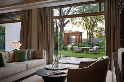 Elle profite d’une véranda privée et offre un espace extérieur généreux avec une sala intime et un bassin profond avec jacuzzi qui donne sur la rivière. Vous pourrez vous y détendre confortablement tout en admirant le panorama. À noter qu’elle est située au troisième étage. Durant votre séjour, vous bénéficierez de tout le confort que cette chambre a à offrir que ce soit en famille ou entre amis.