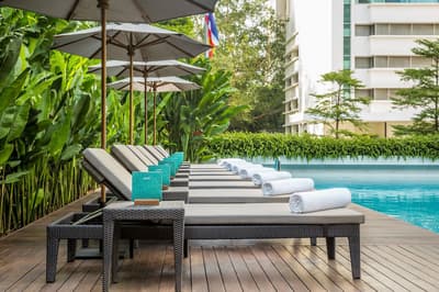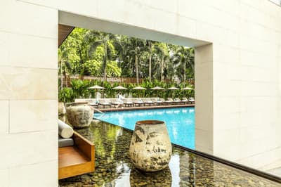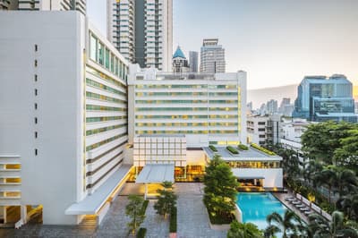 Si vous levez la tête et que vous ne voyez pas le toit du Como Metropolitan Bangkok, ne vous inquiétez pas, c’est normal. Cet immense bâtiment vitré fait partie des gratte-ciels de la capitale thaïlandaise, et ce n’est pourtant pas le plus haut. N’essayez pas non plus de tremper vos pieds dans les deux grands bassins ornés de sculptures en fer devant l’hôtel, ce ne sont pas des piscines, ils sont juste là pour la déco… Une fois à l’intérieur, vous vous transformerez immédiatement en un jeune cadre dynamique. Le Como Metropolitan est branchouille à souhait. La déco contemporaine dégage une ambiance hyper stylée, rythmée par les dernières chansons à la mode. Vous en oublierez presque que vous êtes en Thaïlande ! Quelques bibelots et œuvres d’art permettent tout de même de vous rappeler que vous êtes bien au royaume de Siam, comme l’armoire vitrée et la superbe commode d’époque installées dans le lobby. Coiffeur, couturier, boutique : on trouve tout dans l’édifice ! Et vous serez certainement bien content de faire quelques brasses dans la piscine de 20 mètres au 1er étage. Enfin un peu de verdure au cœur de la ville ! Le bassin est entouré d’arbres immenses, mais cela ne vous empêchera pas de jeter un coup d’œil entre les branches…