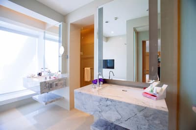 Très spacieuse, c’est une suite indépendante avec un vrai salon, un bureau et une salle à manger. Ses grands panneaux vitrés offrent une vue merveilleuse sur la ville animée et sur les grattes ciel. Elle est confortable et agréable avec tout le nécessaire pour profiter d’un séjour luxueux. Salle de bain chic profitant également de la vue avec baignoire et douche à effet de pluie.