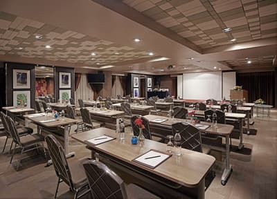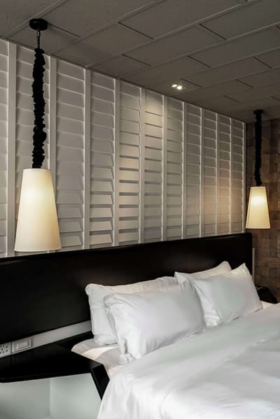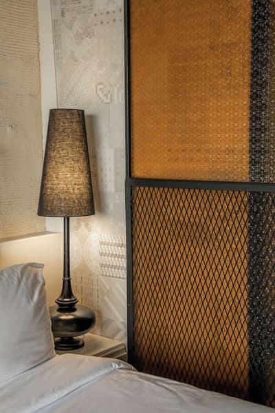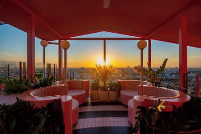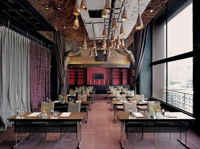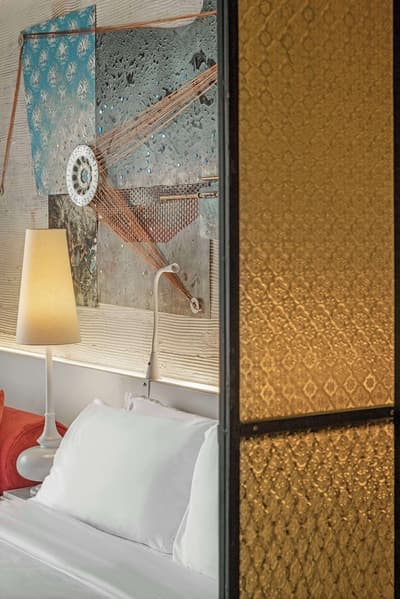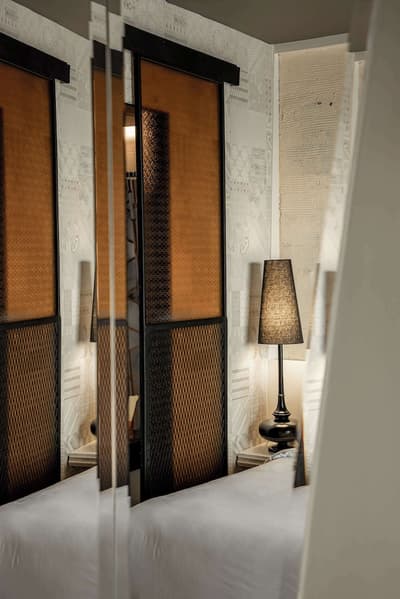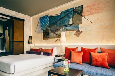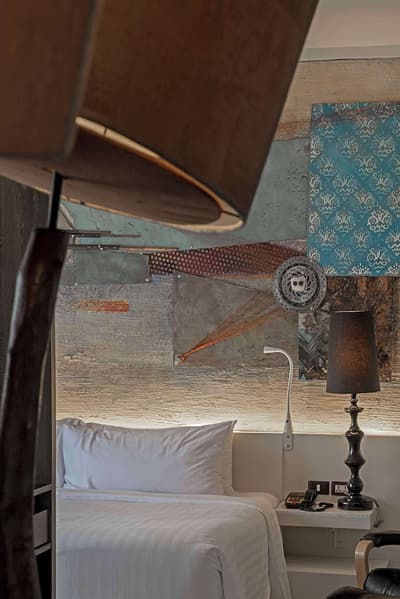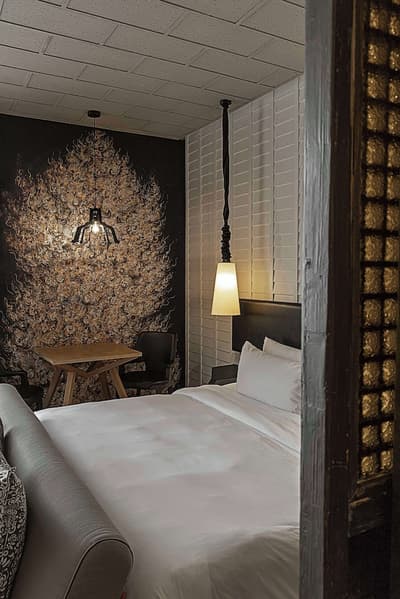 Original, le Siam@Siam ne l’est pas que par son nom ! Aux univers zen et épurés de certains hôtels d’Asie, lui préfère l’excentricité et l’éclectisme. Osé ! Le spectaculaire lobby est un festival de couleurs et de matières avec un plafond recouvert de lamelles de bois superposées : un joyeux chaos qui fait écho à celui de Bangkok, cette drôle de ville-monde en constante effervescence. Vous croiserez ici d’étranges œuvres d’art : une main géante qui sort d’un mur, des masques traditionnels revisités, des personnages en taille réelle fabriqués en fil de fer. Du street art aussi, avec des yeux immenses sur les portes de l’ascenseur, des jeunes femmes en plein effort dans la salle de fitness… Dans les chambres, le décor s’inspire des signes astrologiques, des éléments naturels : terre, air, feu, eau… C’est là encore chargé, souvent un peu foutraque, entre les canapés baroques et les tissus tendus, mais toujours dans un esprit feel good. Or, n’est-ce pas là l’essentiel ? Le bar à cocktails Paradise Lost au 25e étage est un must dans son genre, avec son mobilier rose bonbon et ses bonnes vibes. Plus bas, au 11e étage, la piscine à débordement fait le buzz avec sa vue plongeante, ô surprise… sur le stade national !