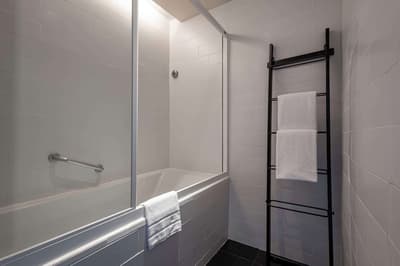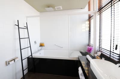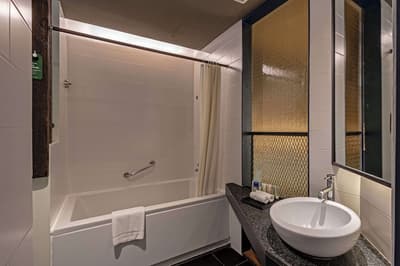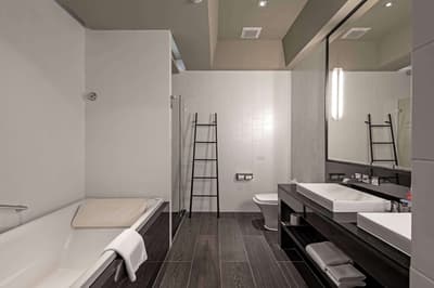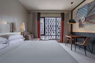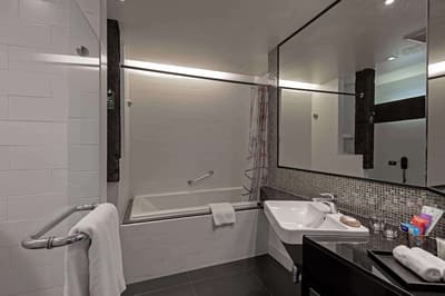 Agréable et très fonctionnelle, elle offre un séjour luxueux. Son grand panneau vitré profite d’une vue merveilleuse sur les hauts bâtiments de la ville. Elle peut accueillir un lit King ou 2 lits doubles et dispose d’un petit coin salon avec une banquette et une petite table. Salle de bain moderne meublé d’une baignoire et d’une douche à effet de pluie.