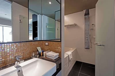 Conçue pour accommoder plus de personnes, elle dispose de 3 lits simples. Son grand panneau vitré profite d’une vue merveilleuse sur les hauts bâtiments de la ville. Elle profite d’un petit bureau et d’un coin salon. Salle de bain moderne meublé d’une baignoire et d’une douche à effet de pluie.