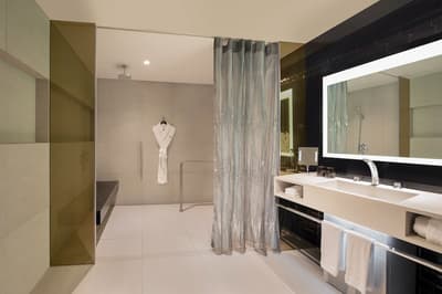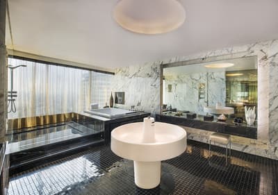 Agréable et très fonctionnelle, cette belle suite offre un séjour luxueux. Sa grande fenêtre vitrée profite d’une vue merveilleuse sur la ville vibrante. Elle dispose d’un fauteuil confortable et d’un bureau dans un coin de la chambre. Salle de bain moderne avec baignoire et douche à effet de pluie.