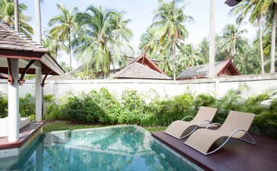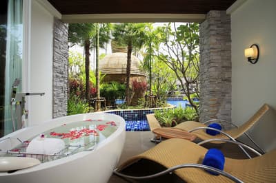 Située au rez-de-chaussée, elle offre un maximum d'intimité à l'intérieur et à l'extérieur et donne sur des jardins tropicaux luxuriants. Ultra spacieuse, elle comprend une piscine extérieure privée avec un kiosque et canapé pour des soirées romantiques.