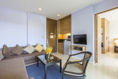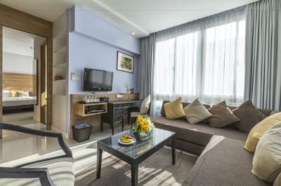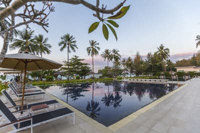 Le point fort du Kantary Beach Hotel, c'est son emplacement entre la White Sand et la Coconut Beach, tout simplement les deux plus belles plages de Khao Lak. D'emblée, le lobby impressionne par sa hauteur, tandis que la réception s'habille de panneaux en bois exotique et d'un immense vase asiatique. Libérez-vous de vos valises et partez à la découverte des lieux. L’hôtel a été conçu autour d'une grande allée bordée de bâtiments contemporains et de bungalows de plain-pied. Tout au bout, l'océan, les restaurants et les beach bars. C’est d'ailleurs depuis la terrasse du Similan Restaurant que vous aurez la plus belle vue. S’il vous prend l’envie de vous faire masser sans quitter la mer des yeux, ça tombe bien, le spa a les pied dans le sable. Une petite soif ? Le comptoir à même la piscine vous évite de sortir de l'eau pour commander un smoothie frais. Côté chambres, la sobriété laisse place à des teintes crèmes, des tapis en jonc de mer et des lampes en céramique thaïlandaise. En journée, les activités se font rare, l'ambiance est à la cool. À la nuit tombée, on vous conseille de monter sur le rooftop pour profiter des couleurs indécentes du coucher du soleil. Coup de coeur pour les tables basses bleu fluo et les banquettes façon club.