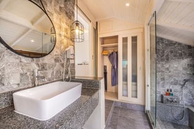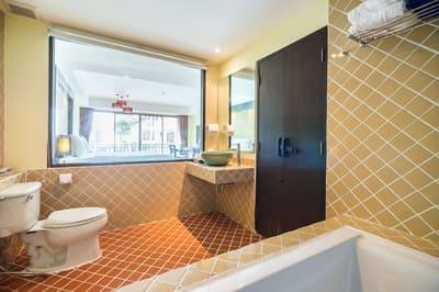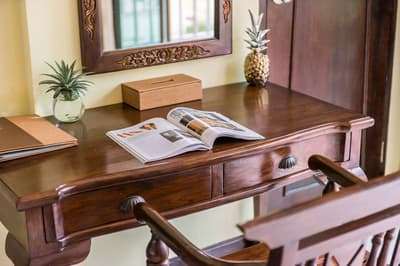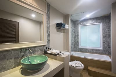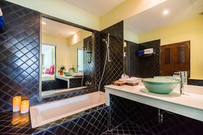 La chambre est spacieuse et élégante et comprend un style de décoration épuré. Elle est dotée d'un mobilier en bois naturel, d'un beau parquet, d'un lit king ou de lits jumeaux, d'un grand bureau et quelques touches de couleurs turquoises complètent l’ensemble. La grande salle de bain est équipée d'une baignoire et douche, le tout dans une atmosphère relaxante et tropicale !