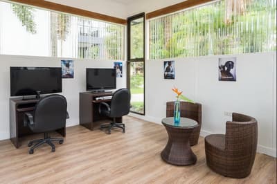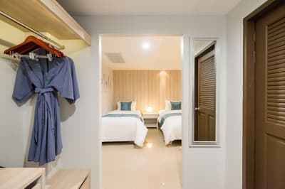 La chambre est spacieuse et élégante et comprend un style de décoration épuré. Elle est dotée d'un mobilier en bois naturel, d'un beau parquet, d'un lit king + Simple + Canapé-lit, d'un grand bureau et quelques touches de couleurs turquoises complètent l’ensemble. La grande salle de bain est équipée d'une baignoire et douche, le tout dans une atmosphère relaxante et tropicale !