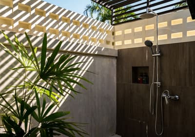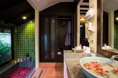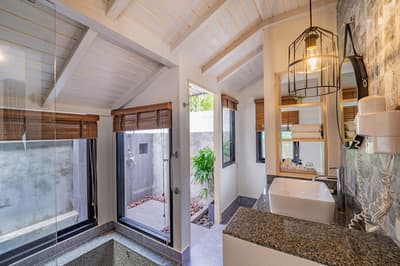 La chambre est spacieuse et élégante et comprend un style de décoration épuré. Elle est dotée d'un mobilier en bois naturel, d'un beau parquet, d'un lit king et quelques touches de couleurs turquoise et violet complètent l’ensemble. La grande salle de bain est dotée d’une baignoire et d’une douche en extérieur. Le tout dans une atmosphère relaxante et tropicale !