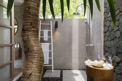 Le top ! Spacieuse et confortable, cette magnifique suite offre calme et sérénité. Sa terrasse dispose d’un jacuzzi et d’un lit de séjour idéal pour apprécier le climat. Elle profite d’un grand salon aménagé de beaux fauteuils et d’un canapé. La chambre bénéficie d’un lit King à baldaquin et peut accueillir des lits supplémentaires pour plus de confort. Douche extérieure en jardin et une salle de bain semi-ouverte avec une baignoire contemporaine et douche à effet de pluie.