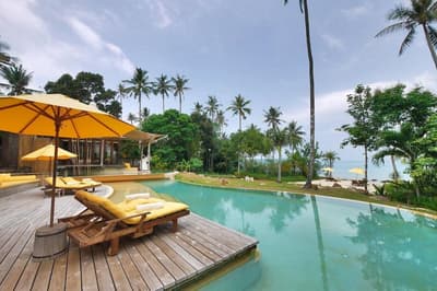 Cette merveilleuse villa en bord de mer, est installée parmi la végétation luxuriante de la côte. Son extérieur est généreux avec sa piscine et sa terrasse aménagée d’une belle banquette et de longues chaises, idéale pour apprécier le climat tropical. Elle est très spacieuse et dispose d’un vrai salon et d’une salle à manger. C’est un petit coin calme et paisible propice à la détente avec un accès direct à la plage. Salle de bain extérieur avec douche à effet de pluie et baignoire encastrée.