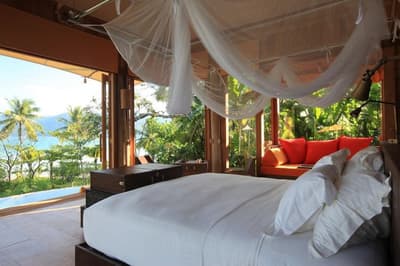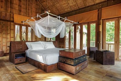 Le Soneva Kiri est un endroit tellement unique qu’il possède même sa propre heure locale. L’hôtel n’est pas un simple resort balnéaire, c’est une vraie destination touristique ! Installé sur l’île de Koh Kood, dans le golfe de Thaïlande, vous êtes juste en face du Cambodge. C’est ici que le mot luxe prend tout son sens, à commencer par la philosophie « no news, no shoes ». Lové au cœur d’une île à la végétation dense, vous profitez des plus belles plages de Thaïlande. Tout en vous promenant à vélo ou à bord de votre voiturette de golf, vous vous apercevez vite que l’architecture de l’établissement a été conçue en matériaux naturels, pour protéger l’environnement. Tout a été pensé afin de préserver au maximum la faune et la flore. Chaque petit édifice semble avoir été déposé avec délicatesse en pleine nature. Et n’imaginez pas que vous allez vous ennuyer sur place ! Vous n’aurez même pas le temps de participer à toutes les activités que l’hôtel propose : initiation à l’astronomie, yoga, méditation, plongée, projection cinématographique au Cinema Paradiso (avec pop-corn et glace à volonté), fabrication d’huile de noix de coco, formation au massage du dos au Spa Six Senses… D’ailleurs, en parlant du spa, pensez à réserver un des soins signature. Vous ne serez pas déçu !