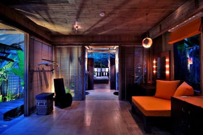 L'extérieur rustique et exotique avec un toit en chaume offre néanmoins un ensemble moderne et luxueux. Dans un style épuré, elle est minimaliste avec une atmosphère légère. Ses grandes baies et fenêtres vitrées créent un ensemble lumineux, procurant une sensation d’espace et d’ouverture. Elle baigne dans des tons sobres avec ses meubles en bois et ses couleurs neutres. De belles lampes agrémentent le tout et y ajoutent de l’élégance. C’est l’idéale pour se couper du quotidien. Quelques touches de couleurs donnent du peps à l’ensemble.