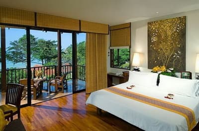 En front de mer, cette chambre deluxe profite d’une vue époustouflante de la baie. Son balcon aménagé de belles chaises et d’une banquette est l’emplacement idéal pour apprécier le climat et l’atmosphère calme et sereine. Elle dispose d’un canapé-lit. Salle de bain bénéficiant également de la vue avec baignoire et douche à effet de pluie.