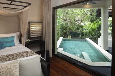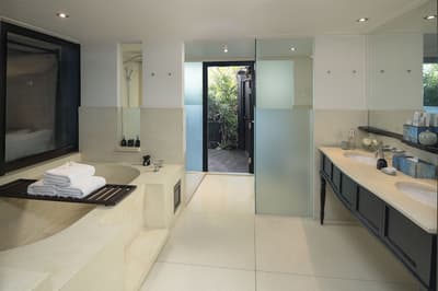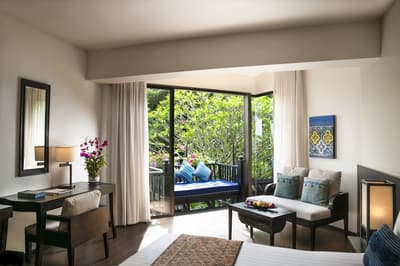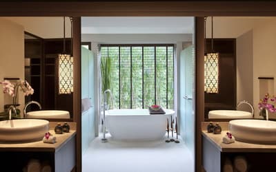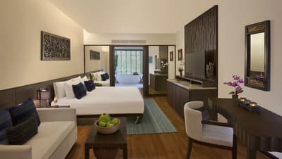 Elle profite d’un accès direct aux jardins et dispose d’une arche pour entrer sur votre terrasse privée entourée de palmiers. À noter que vous pourrez vous chouchouter avec les produits apaisants du Spa Anantara.