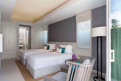 107 m² d'espace intérieur et 120 m² d'espace extérieur, Deux chambres séparées avec espaces de vie distincts, Accès direct à la plage, Piscine privée avec terrasse extérieure et solarium, Espace de vie avec canapé, Une chambre avec un lit king-size et une chambre avec deux lits simples, Salle à manger, Kitchenette, Douche à effet de pluie, Mini bar, Machine à café Nespresso, Coffre-fort électronique dans la chambre, TV avec chaînes satellite, Apple TV, Bureau de travail, Wi-Fi gratuit dans la chambre, Climatisation à réglage individuel, Haut-parleur Bluetooth portable.