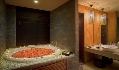 C’est l’idéale pour les couples ! Cette magnifique suite rooftop offre une vue spectaculaire et panoramique sur l’océan. Elle dispose d’un petit jardin extérieur calme et propice à la détente, aménagée d’un jacuzzi et de belles chaises. Salon avec table à manger. Elle baigne dans une atmosphère romantique et c’est le top pour un séjour luxueux et cosy. Salle de bain chic avec douche à effet de pluie.