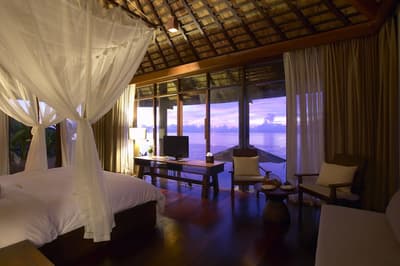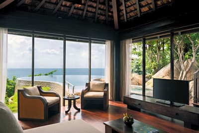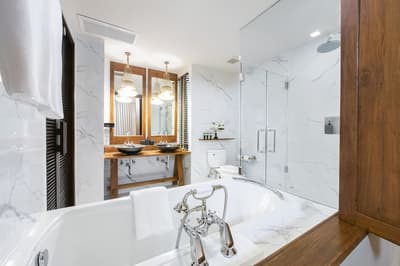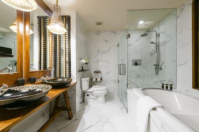 Installée à l’étage, cette belle suite offre une vue époustouflante sur l’océan. Elle surplombe la verdure luxuriante du complexe et baigne de calme et de sérénité. Son balcon profite d’un jacuzzi et de banquettes pour apprécier le climat. Elle dispose d’un petit bureau en chambre. Salle de bain élégante avec baignoire et 2 vasques.