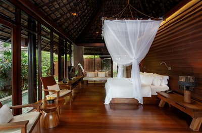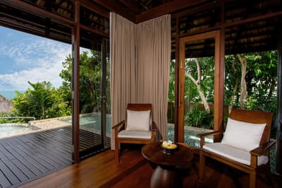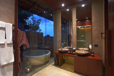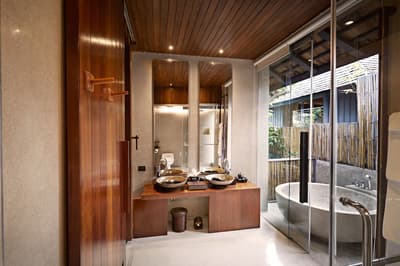 Entourée par la végétation luxuriante du complexe, cette belle villa baigne dans le calme et la sérénité. Son extérieur est généreusement aménagé d’une piscine et de longues chaises. Petit coin salon en chambre avec de beaux fauteuils. C’est le top pour se couper du quotidien. Salle de bain avec baignoire et douche extérieure.