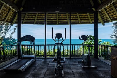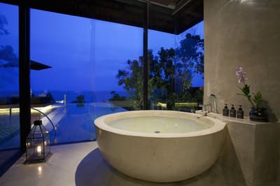 Très spacieuse, cette magnifique villa offre un généreux extérieur avec une piscine et une terrasse avec de longues chaises. Elle surplombe la végétation luxuriante et profite d’une vue partielle sur l’océan. C’est un cadre relaxant et reposant. Salle de bain avec baignoire et douche extérieure.