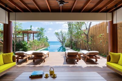 Incroyablement spacieuse, cette suite de 2 chambres offre un coin intime, mais tout de même convivial. Installée en front de mer, elle profite d’une vue époustouflante sur le golfe de Thaïlande. Son extérieur est généreusement aménagé d’une piscine, de chaises longues, de beaux fauteuils et d’un pavillon. Elle dispose d’un vrai salon avec de beaux fauteuils confortables et une petite table. Salles de bains avec douche à effet de pluie.