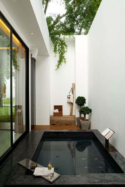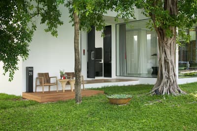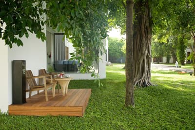Située au rez-de-chaussée, elle profite d’un petit jardin aménagé de belles chaises. Elle est entourée par la nature luxuriante et baigne dans le calme et la sérénité. Dispose d’un patio avec un petit bureau et un espace confortable. Petit coin salon en chambre avec un canapé et peut accommoder un lit King ou 2 lits doubles. Salle de bain chic avec douche à effet de pluie.