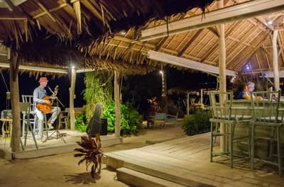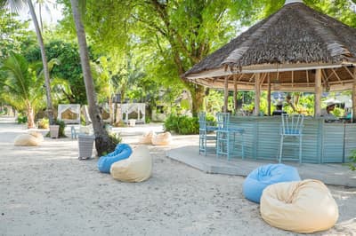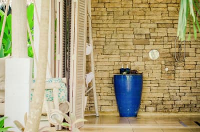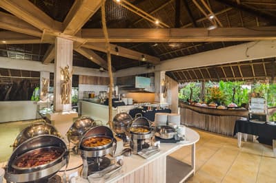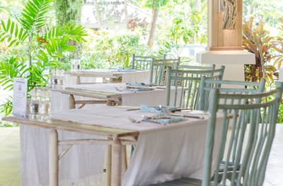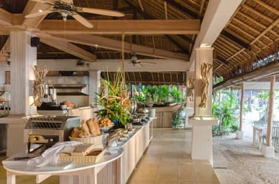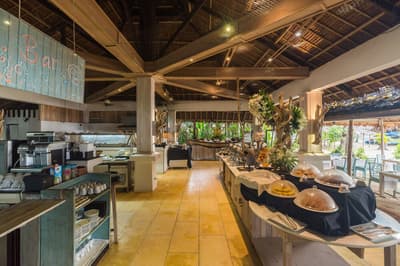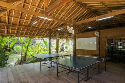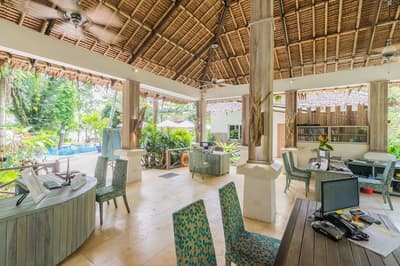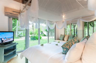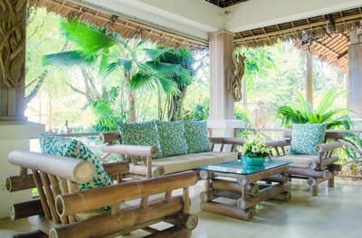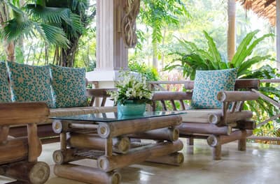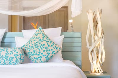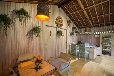 Elle offre un cadre idyllique avec son intérieur moderne, mais tout de même exotique. Elle est d’une simplicité exquise et baigne dans une atmosphère faisant rêver. Ses grands panneaux vitrés laissent pénétrer la lumière naturelle et rendent la pièce lumineuse et accueillante. Les meubles et les décorations en bois s’harmonisent avec la nature environnante. Quelques touches de couleur bleue la rendent légère.