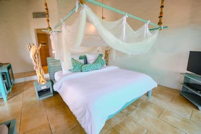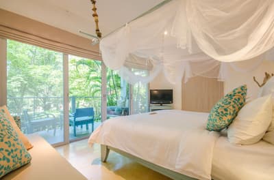 Nichée parmi la nature luxuriante du complexe, elle baigne dans une atmosphère reposante et relaxante. Sa terrasse ou son balcon est aménagé d’un fauteuil en balançoire et de belles chaises. Elle peut accommoder un lit King ou 2 lits doubles et dispose d’un canapé lit. Salle de bain ouverte avec douche à effet de pluie.