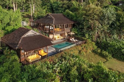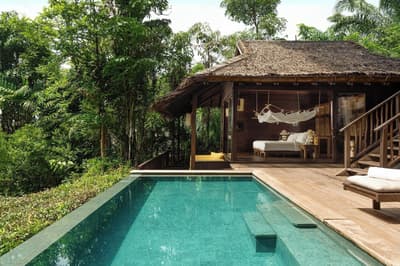 Idéale pour les couples, elle baigne dans une atmosphère romantique. Installée dans les hauteurs, elle surplombe la végétation luxuriante et profite d’une vue époustouflante sur l’océan. Son extérieur profite d’une piscine, d’un pavillon et de longues chaises pour apprécier le climat et la vue. Salle de bain avec douche en plein air et 2 vasques.